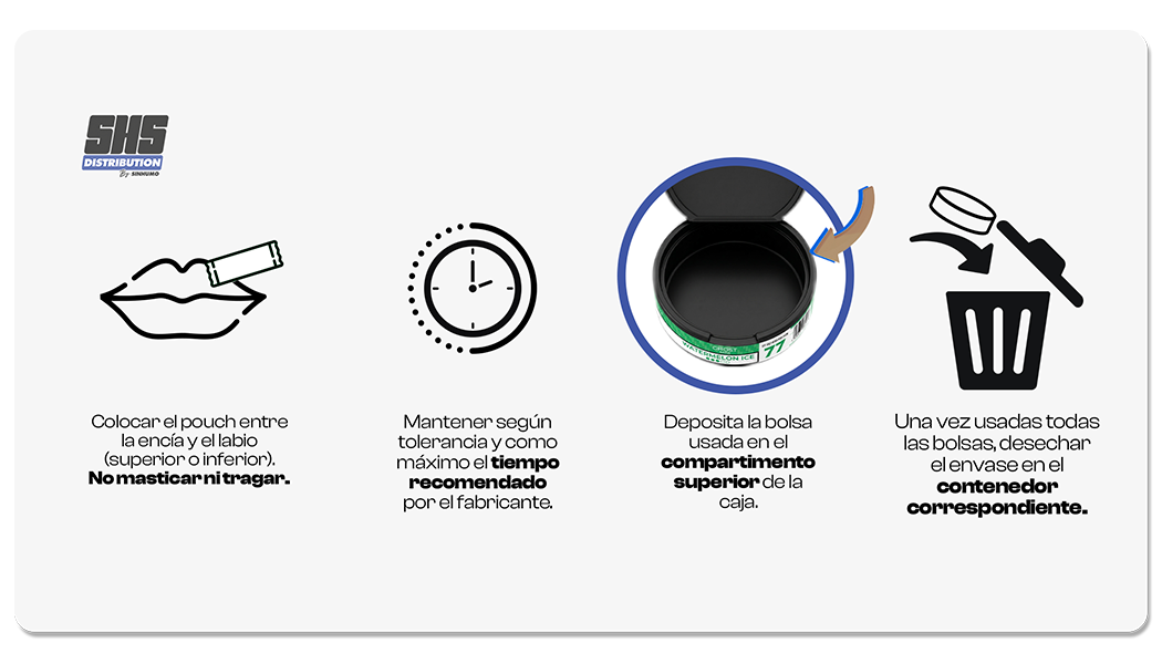 Las bolsas o pouches de cafeína se colocan entre el labio y la encía durante un máximo 30 minutos, retirándola y desechando una vez finalizada, no se pueden masticar ni tragar. Las bolsas de cafeína NO contienen nicotina ni azúcar.